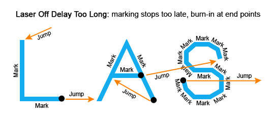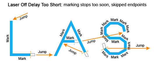The Laser Off Delay can be used to prevent burn-in effects at the end of a vector. This delay in time before the laser is turned off is typically used to turn off the laser just before the last few microsteps of a mark command to ensure that the marking stops exactly where it is desired to stop.Typically, too short of a delay will cause skipping of line segments, and too long of a delay will cause burn-in at the end of line segments.