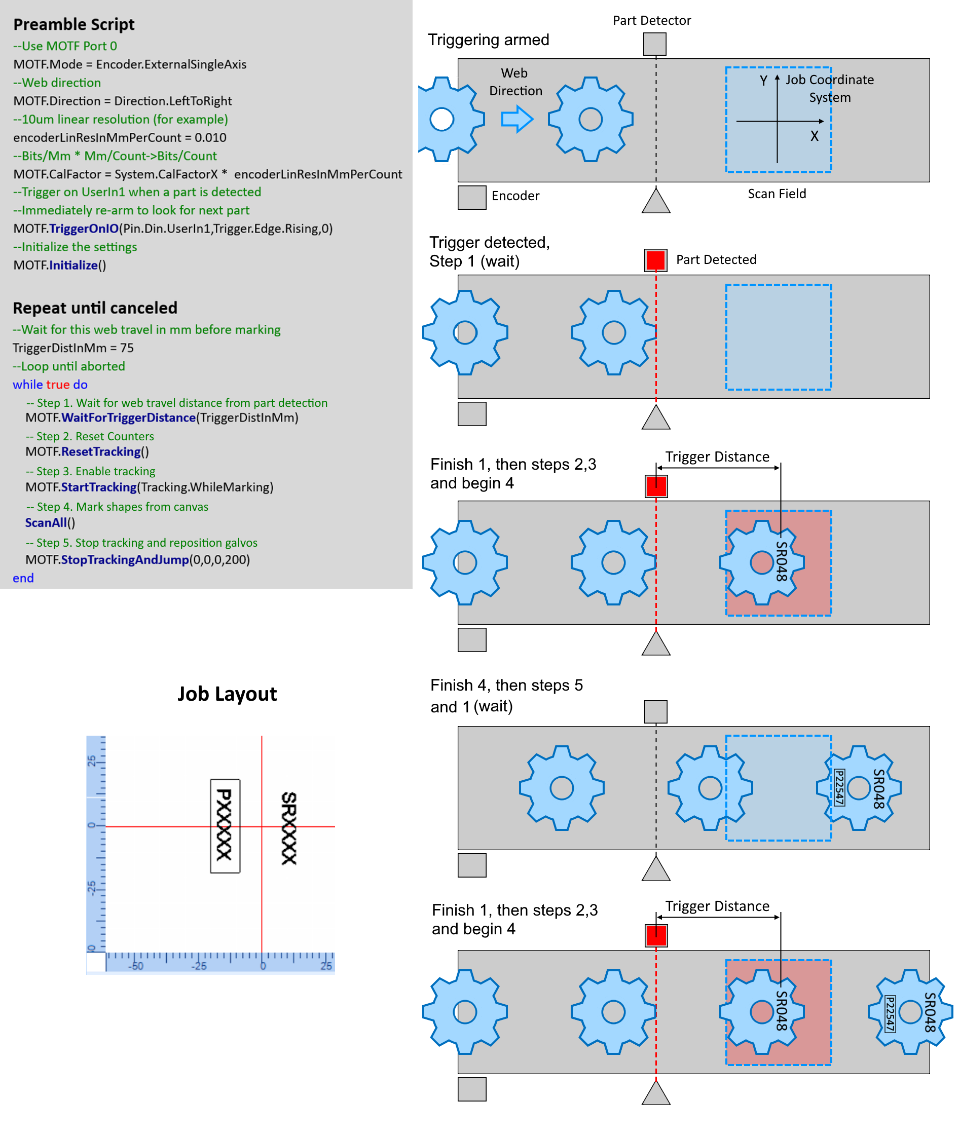 The MOTF commands are designed to permit multiple scenarios that include variable spaced part detection, uniformly spaced image marking, and tiling based continuous image marking. The diagram below illustrates how a Script would initiate and control a sequence of MOTF operations where a part is detected and marking synchronized with the position and motion of each part.