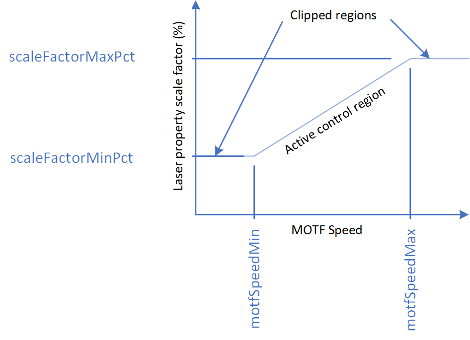 | scaleFactorMinPct | float | Scale factor in % applied the laser parameter set-point when the MOTF speed is at the minimum specified value. |